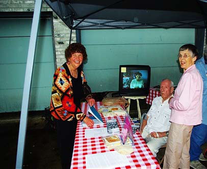 Pat Day and Shiela Jones look on as former teacher Stan Frear mans a booth to sell his poetry books.