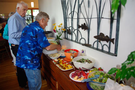 The eating begins with the buffet line . . . Ken Dahlager and Bob Vosejpka making their way
